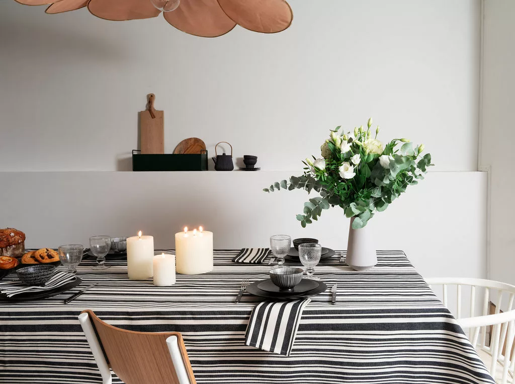 La nappe est confectionnée avec un tombé de 25 cm de chaque côté.