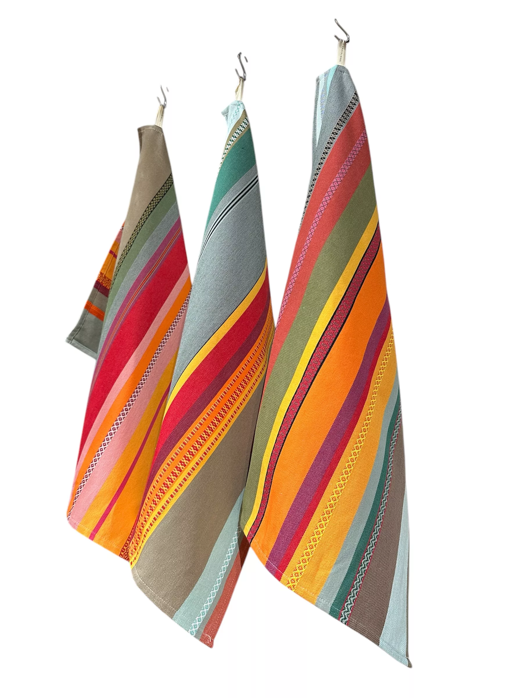 Pour la confection de nos torchons, nous utilisons un tissu d’une grande largeur de 180 cm, permettant de réaliser trois pièces par coupe. Les toiles à rayures asymétriques donnent vie à des créations uniques, chacune présentant des variations.