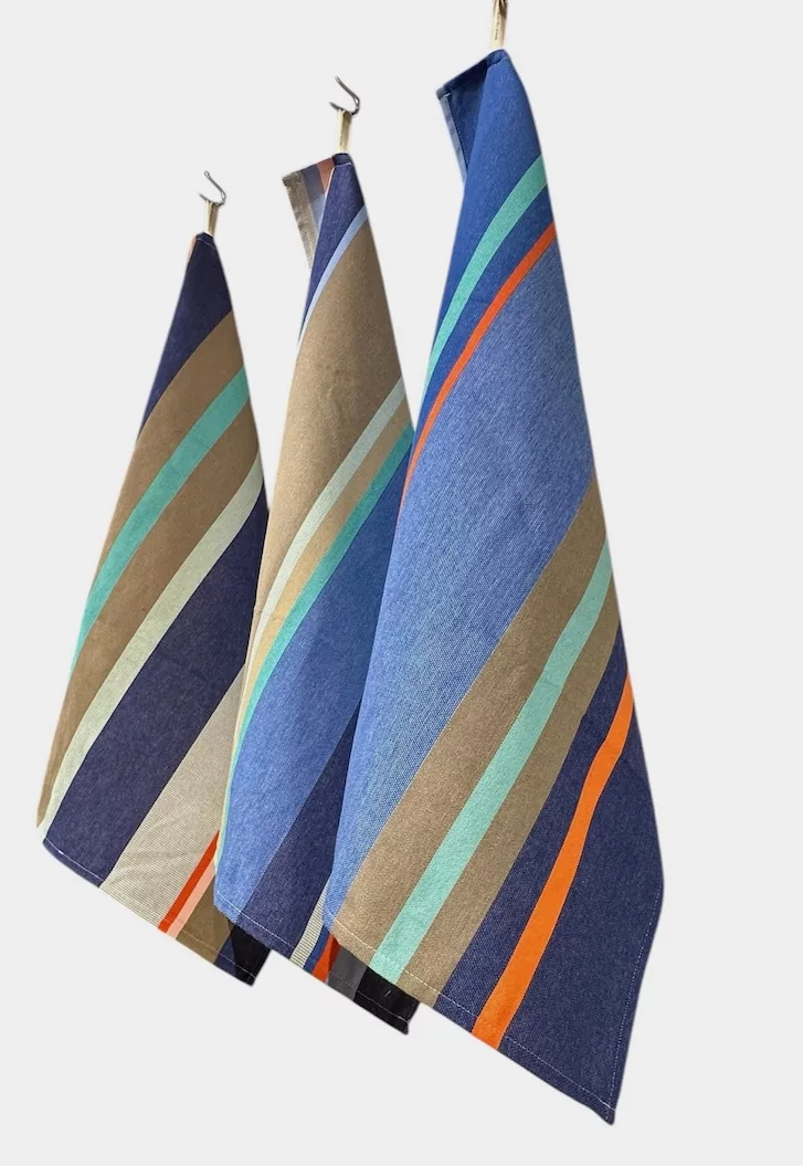 Pour la confection de nos torchons, nous utilisons un tissu d’une grande largeur de 180 cm, permettant de réaliser trois pièces par coupe. Les toiles à rayures asymétriques donnent vie à des créations uniques, chacune présentant des variations.